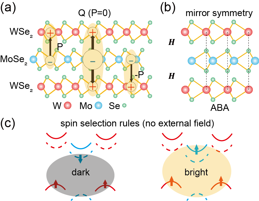 (a):三层异质结的激子示意图;(b):堆垛方式及对称性;(c):电四极激子的辐射选择定则。