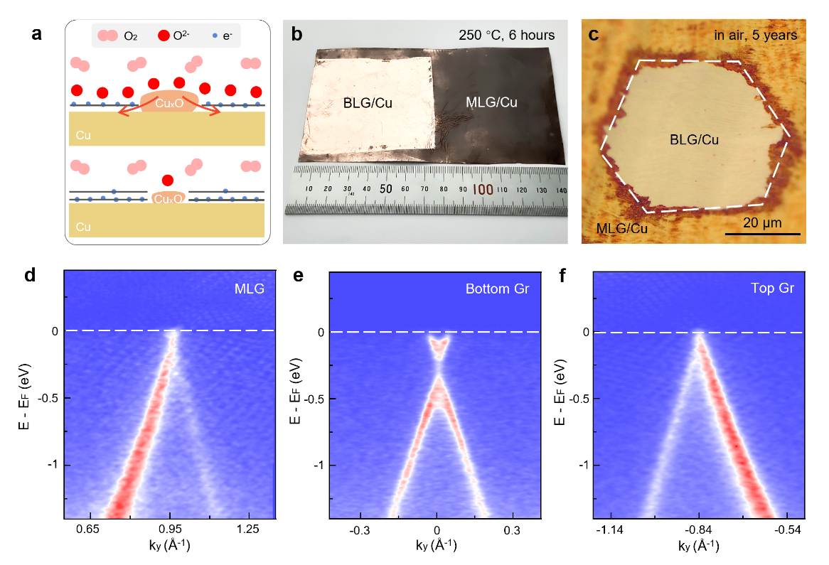 人工微结构和介观物理国家重点实验室刘开辉教授与上海科技大学王竹君教授等合作者揭示了铜上双层石墨烯的双面各异掺杂机制,成功实现了对铜箔的超高效防腐,可在200 ℃下保护铜箔1000小时以上,达到了工信部《重点新材料首批次应用示范指导目录》中要求的1000倍,有望拓展铜在高温、高湿等极端环境下的应用前景。2023年11月17日,相关研究成果以“双面各异掺杂双层石墨烯增强铜抗腐蚀性能”(Enhanced copper anticorrosion from Janus-doped bilayer graphene)为题,在线发表于《自然·通讯》(Nature Communications)。