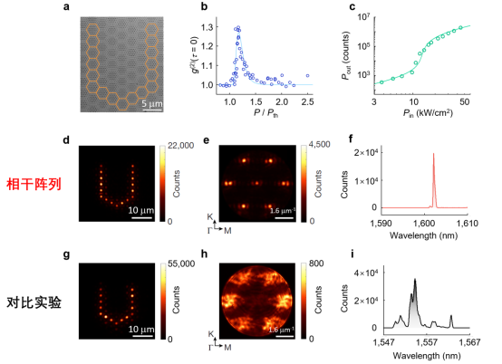 图4. U形莫尔纳米激光阵列相干特性。(a)扫描电子显微镜照片,橙色六边形标出了构成U形的17个莫尔纳米激光;(b)相干阵列的二阶强度关联函数随泵浦功率变化图;(c)输出功率随输入功率变化图;(d-f)相干阵列激射的实空间图案(d)、动量空间图案(e)和光谱(f);(g-i)作为对比器件的非相干阵列激射的实空间图案(g)、动量空间图案(h)和光谱(i)。