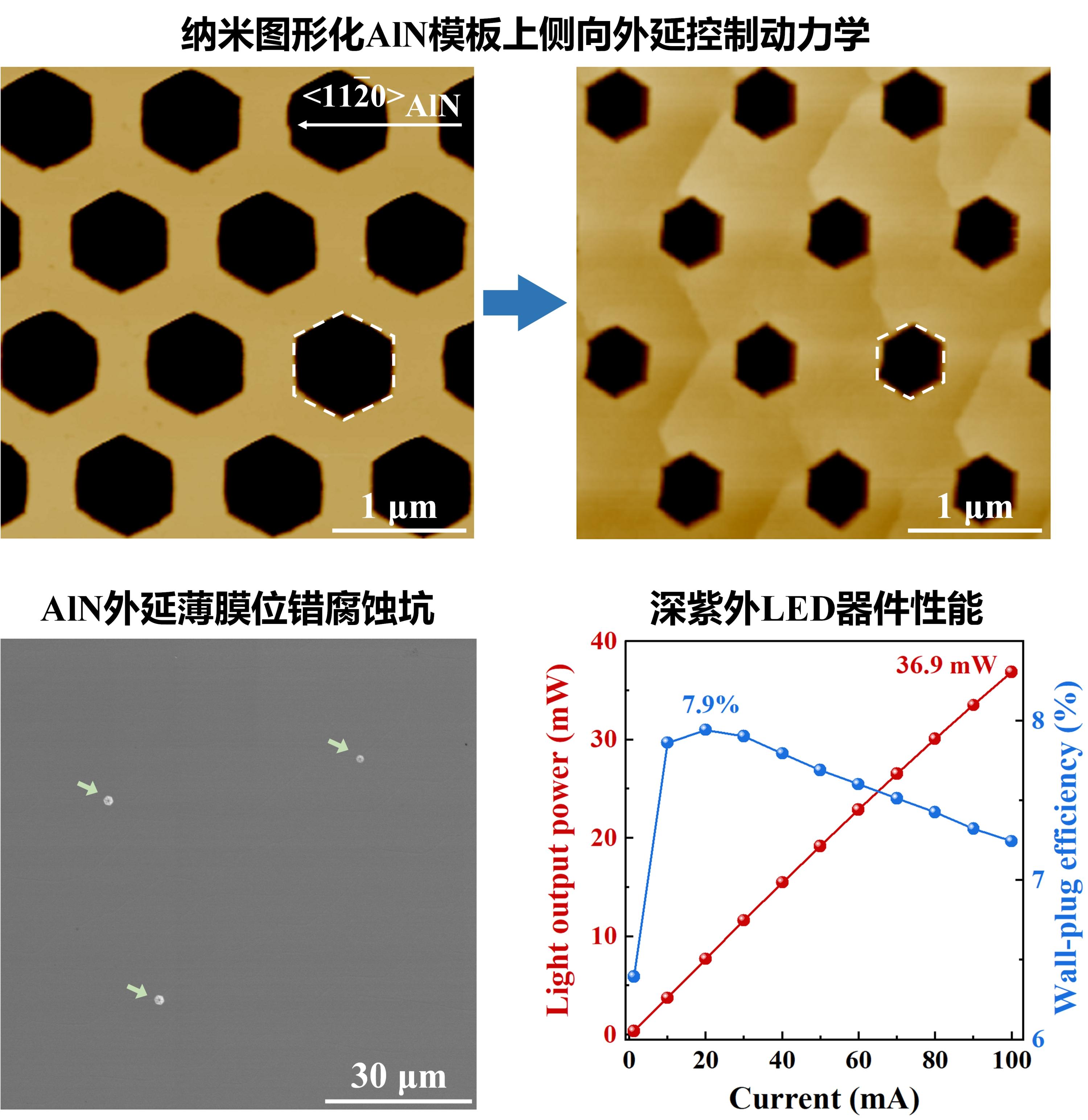 沈波教授、许福军副教授团队针对大失配异质外延导致氮化物宽禁带半导体高缺陷密度的难题,创新发展了一种基于纳米图形化AlN/蓝宝石模板的“可控离散和可控聚合”侧向外延方法,使蓝宝石衬底上AlN外延薄膜位错腐蚀坑密度大幅降低了两个量级,至~104cm-2,实现了接近衬底级晶体质量的AlN外延薄膜,并应用于相关器件研制。2023年6月22日,相关研究成果以“接近衬底级晶体质量的氮化物宽禁带半导体异质外延薄膜”(Group-III nitride heteroepitaxial films approaching bulk-class quality)为题,在线发表于《自然·材料》;物理学院博士后王嘉铭和2019届博士研究生解楠为该论文共同第一作者,许福军和沈波为共同通讯作者。