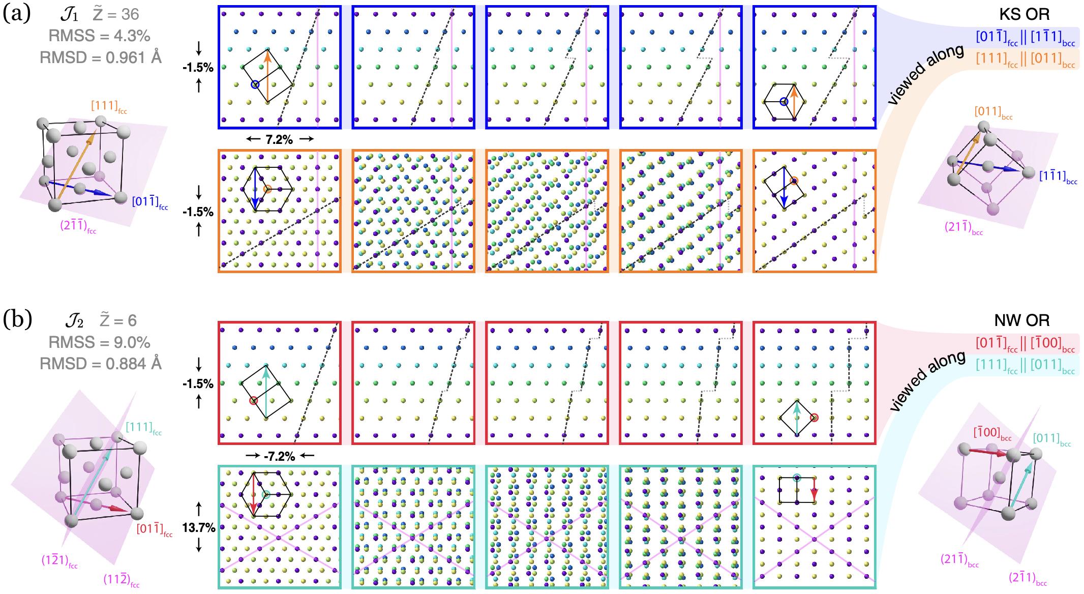 本实验室李新征课题组从2021年开始,针对这一问题寻求数值解决方案。研究过程中,王方成同学创新性地提出子晶格匹配(sublattice match, SLM)的概念,用以描述CSM的空间周期和晶格形变。以往,人们用一对初/末超胞描述SLM,但这种描述方式具有GL(3, Z)任意性,使SLM的穷举受到严重阻碍。利用整数矩阵的Hermite标准形──实矩阵的最简阶梯形在整数环上的对应概念,研究团队消除了这一“规范冗余”,使得SLM的描述方式唯一。通过将CSM按其SLM分类,研究团队证明了候选CSM数目的有限性,并发布CSM穷举算法Crystmatch。以铁的马氏体转变为例,Crystmatch只需30秒即可在PC上复现所有已知CSM,并在后续计算中给出数千个应变小于TS机制(此前已知的应变最小者)的新机制。通过分析初/末晶格的位向关系(orientation relationship, OR),研究团队发现穷举结果中恰有两个CSM能在无旋转的条件下,分别给出马氏体转变中最著名的Kurdjumov-SachsOR和Nishiyama-WassermannOR,解答了这两个1930年代以来备受关注的晶体学问题,如图二所示。此工作展示了CSM穷举策略空前的效率和完备性,也为后续的固固相变机制研究提供了新的可能。