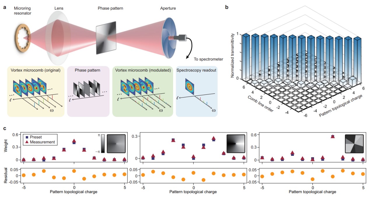 最后,该研究还展示了涡旋光谱学的概念,即利用涡旋微梳一次性识别频域中拓扑荷分布的可能性。实验中,涡旋微梳被用于测量光学路径中的拓扑荷分布,并通过全息图案编码模拟自由空间通信通道中的湍流空气涡旋。如图4所示,实验结果与模拟数据高度一致,展现了这一技术在新型光谱分析和高维度光学编码方面的巨大潜力。