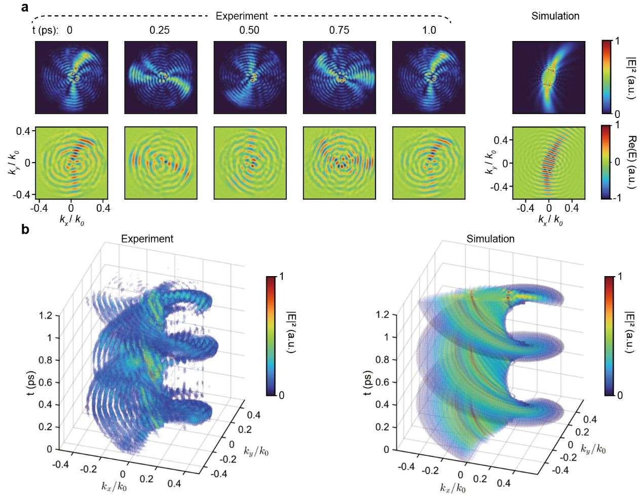 图3. 涡旋孤子微梳的时空结构表征。a, 不同时间延迟下的横截面的电场强度和实部分布的测量和模拟结果。b, 光束强度的时空演化重构的测量和模拟结果。