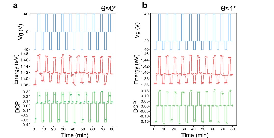 图3. 电控转角异质结构中的谷编码。(a-b) 周期性偏置电压(蓝线)下器件θ≈0°(a)和θ≈1°(b)的IXs发射随时间变化的能量(红点)和DCP(绿点)。