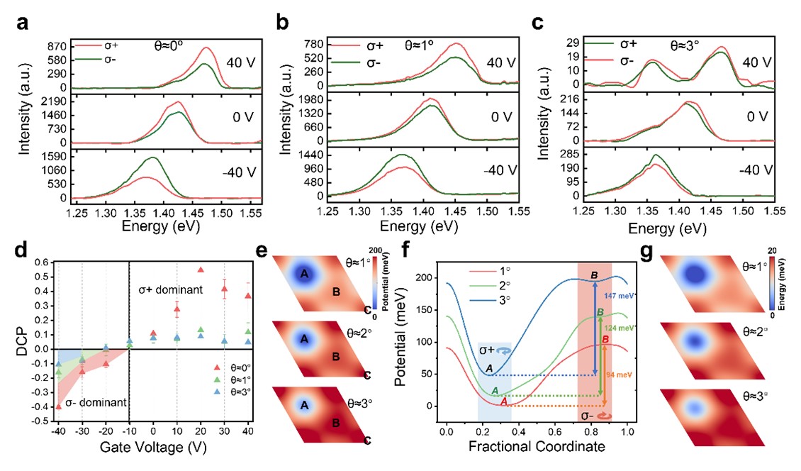 图1. 转角依赖的极化性质。(a-c) θ≈0°、θ≈1°和θ≈3°时- 40、0和40 V的偏振分辨PL光谱 (T = 10 K)。(d) 三个转角器件IXs的DCP随栅压的变化。(e) 不同扭转角度下的激子势能的等高线图。(f) 图(e)的对角线扫描曲线及摩尔激子的层间光学选择定则。(g) 层间e-h交换能的等高线图。