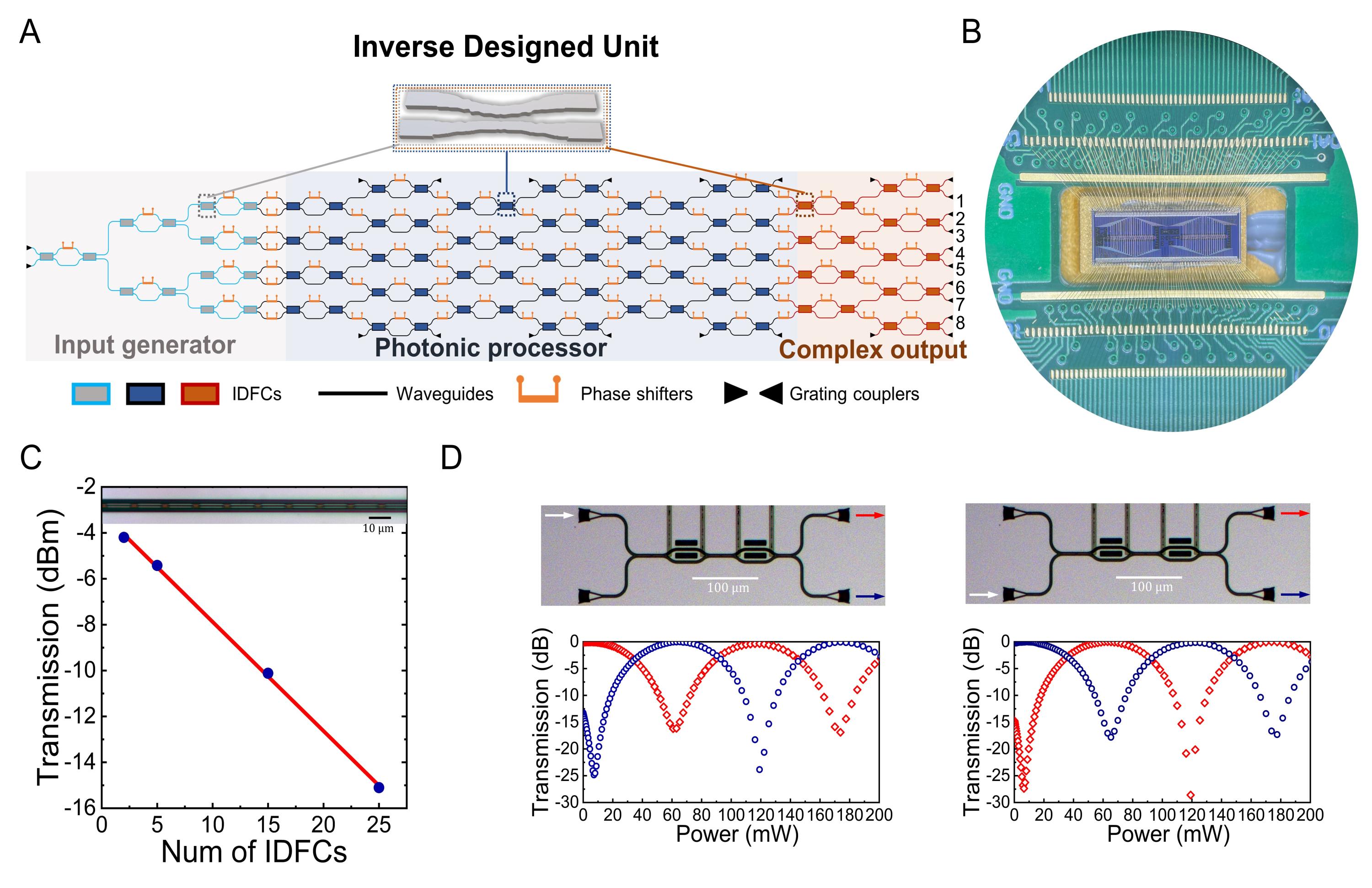图1.芯片结构图以及单元结构测试结果。(A)芯片结构示意图,芯片由输入态制备部分、信息处理器和输出部分组成。(B)封装后的芯片照片。(C)若干定向耦合器串联透射率拟合结果。(D)由两个逆向设计的定向耦合器和一个电极组成的新型MZ干涉仪的透过率随着电极上所加功率的变化曲线。