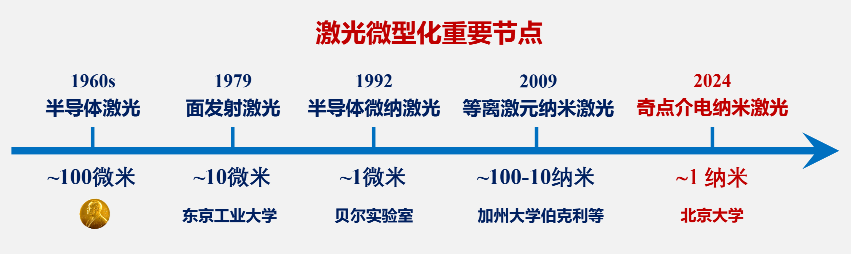 图1.激光微型化的重要节点。北京大学构建了介电质体系突破光学衍射极限的理论,发明了制备具有原子级特征尺度光学纳腔的新方法,首次提出并实现了奇点介电纳米激光,将激光特征尺度推进至原子尺度。