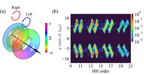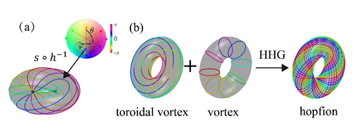 图3.(a)Q=1的霍普夫子拓扑结构。 (b)利用涡环光场(toroidal vortex)和涡旋光场(vortex)双色光场驱动,通过高次谐波非线性过程形成高阶霍普夫子。