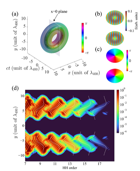 图1. 涡环光场高次谐波频谱出现独特的空间啁啾特征,频域干涉条纹数量反映了谐波横向轨道角动量的阶数。