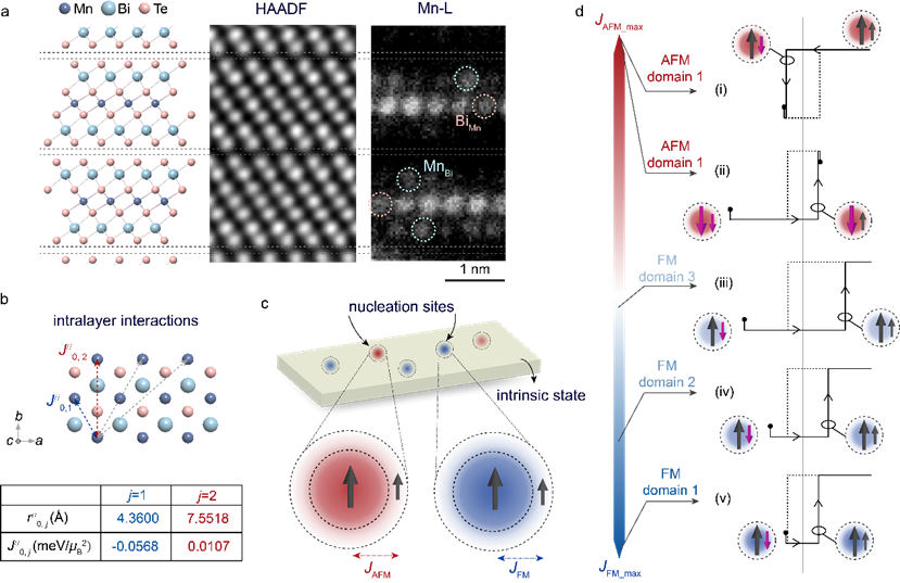 图3. a MnBi2Te4原子结构图及STEM对晶体结构和元素的表征;b第一性原理计算的面内最近邻和次近邻磁耦合作用强度。c局域的高缺陷浓度区域中存在的缺陷磁畴结构,将其简化为等效的FM或AFM耦合的双自旋模型。d多种缺陷结构下,理论模型对初始化磁场后各个磁翻转场行为随HS演化的描述。
