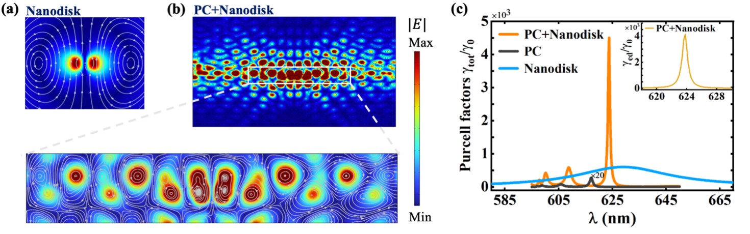 图3 (a) 裸纳米圆盘磁偶极共振的电场图,白色流线表示磁场线。(b)上图:复合结构中边缘态的电场图,下图:边缘态的电场图, 白色流线表示磁场线。(d)裸纳米圆盘,裸拓扑光子晶体,复合结构中总的Purcell 系数,插图是复合结构中,沿着边缘态传播部分的Purcell 系数。