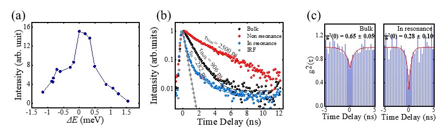 图3. 与莫尔腔耦合的单个量子点的Purcell效应和单光子发射特性。(a), 量子点的荧光强度随量子点-腔模失谐能变化的关系图。(b), 量子点在体材料,与腔模共振,非共振以及系统 仪器响应的衰减曲线。(c), 量子点发射的单光子二阶关联函数测量。