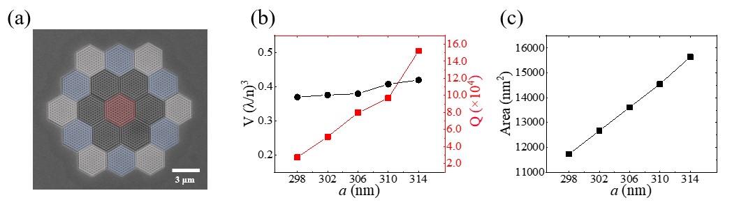 为解决上述挑战,许秀来教授与龚旗煌院士团队提出了优化设计方案,并成功实现莫尔超晶格的高质量制备(见图1)。通过调控单层光子晶体的填充因子,显著扩展了适用于量子点布置的有效区域。优化后的结构在保持模式体积基本不变的前提下,品质因子提高了一个数量级,有效面积提升了约35%,为实现量子发射体与莫尔腔的高效耦合提供了可能。