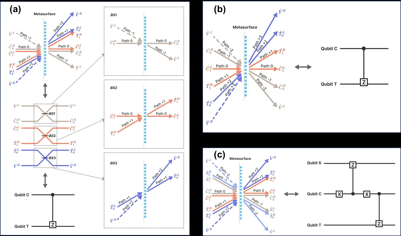 研究团队通过设计一种具有几何相位梯度的超构表面,利用其偏振依赖的并行分束功能,首次提出了在单片超构表面上实现偏振编码(如图1)和路径编码的量子CZ门的理论方案。在研究团队前期的研究中,发现单片几何相位梯度超构表面可以发挥类似并行排布的分束器阵列功能,即并行分束。在本工作中,进一步利用了超构表面并行分束提供的多光子干涉能力,通过合理设计分束比并选取三个相邻的圆偏振分束过程,成功在单片超构表面上构建了偏振编码的CZ门[如图2(a)所示]。