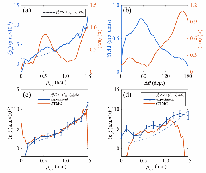 更进一步,基于非偶极效应对电子再碰撞的高敏感性,研究人员提出了可直接实验验证的电子关联判据:通过动量守恒筛选不同离子动量区间,分别提取同向出射与背向出射电子的平均动量偏移,结果如图2 c-d所示。同向出射电子的非偶极偏移与独立电离预期吻合;而背向出射电子整体呈现更大的上移,对应更高的再碰撞概率。这建立了强场双电离中电子关联效应与非偶极效应之间直接联系,并得到了实验验证,为理解强场多体系统中的线动量传递与电子关联提供了新视角。