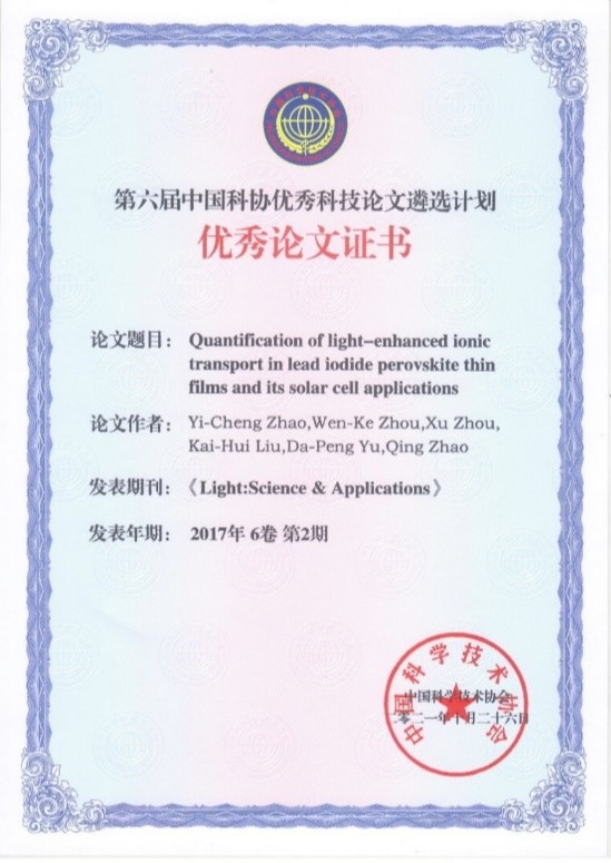 日前,中国科学技术协会公布了第六届优秀科技论文遴选计划95篇入选论文的名单。北京大学人工微结构和介观物理国家重点实验室赵清教授课题组发表的研究论文“定量化研究铅碘钙钛矿薄膜中的光增强离子输运及其在太阳能电池中的应用”(Quantification of light-enhanced ionic transport in lead iodide perovskite thin films and its solar cell applications)作为物理学科(数理化与交叉学科集群)基础研究型论文榜上有名。