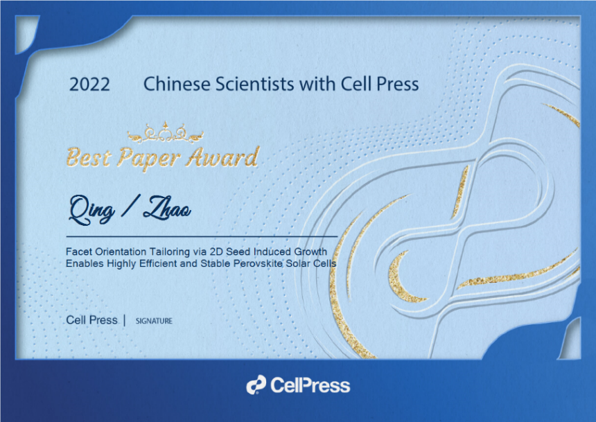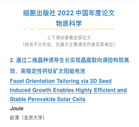 近日,细胞出版社(Cell Press)公布了2022 中国年度论文奖。2022年,共有1932篇第一完成单位为中国机构的研究论文发表在细胞出版社旗下期刊。经期刊编辑提名、第三方专家委员会的独立评审,并综合论文下载量、引用量和领域内突破性等权衡标准,细胞出版社从中评选出了生命科学领域、物质科学领域、医学领域、交叉学科领域和可持续发展领域“细胞出版社2022中国年度论文”共40篇(医学、可持续科学领域各5篇,其他三个领域各10篇)。其中,人工微结构和介观物理国家重点实验室赵清教授以通讯作者发表在《焦耳》(Joule)上的论文“通过二维晶种诱导生长实现晶面取向调控构筑高效、高稳定性钙钛矿太阳能电池”(Facet Orientation Tailoring via 2D Seed Induced Growth Enables Highly Efficient and Stable Perovskite Solar Cells)入选了物质科学领域2022中国十大年度论文。